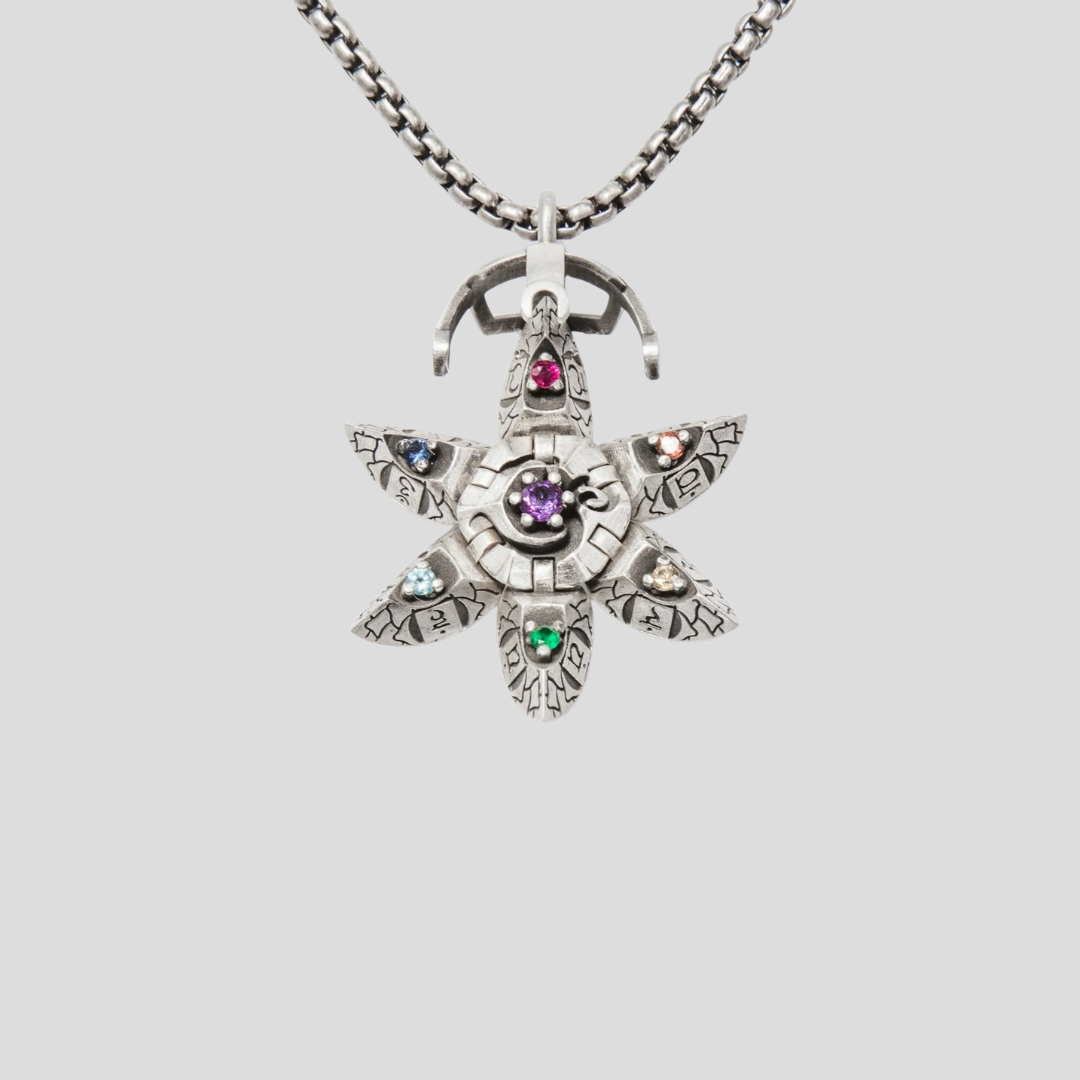 This piece is designed to provide balance for those that wear it across their chakras. Infused with symbolism and precious gem stones of each chakra, this piece starts as an orb and folds out to a six point star / seed of life. The energy one feels when wearing this piece is both powerful and magical. Can be worn open or closed. (Sterling Silver Version with 2.5mm Ruby, Citrine, Yellow Sapphire, Emerald, Topaz, Blue Sapphire, and 3.5mm Amethyst)