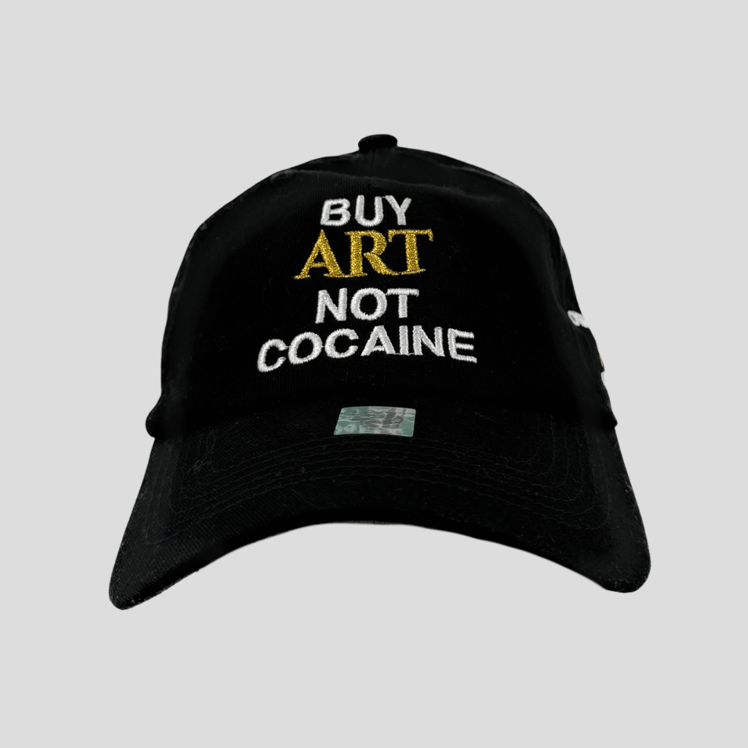 A statement piece stitched into a classic dad cap. Embroidered front hit reads “BUY ART NOT COCAINE” with side detailing from House of Lions and ArtAche Hotel. Offered in washed denim or solid black.