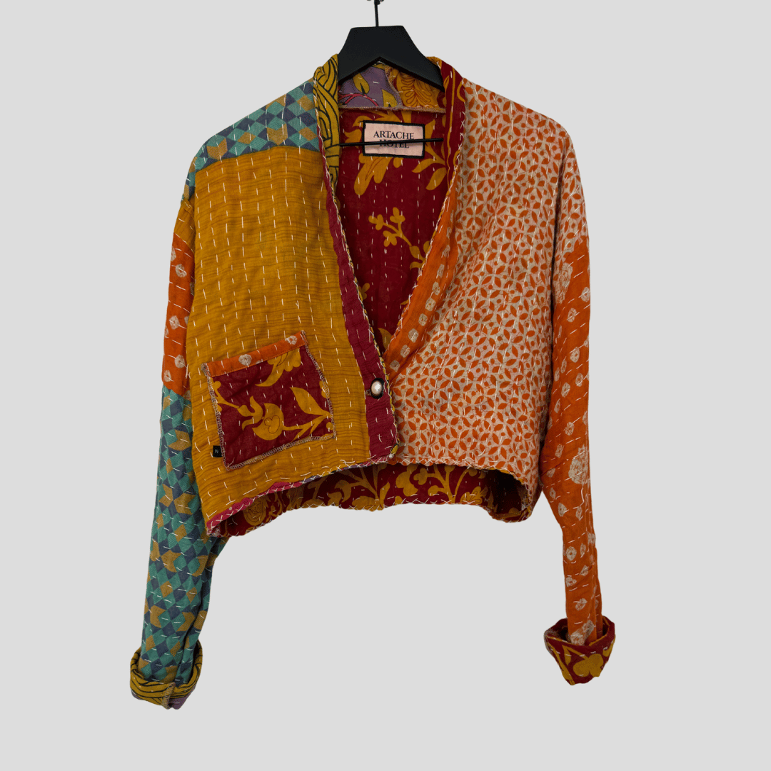 Cropped reversible jacket made from vintage sari quilts, featuring orange, mustard, blue, and red patchwork. Kantha hand-stitching runs across both sides, carrying the sari’s layered history.