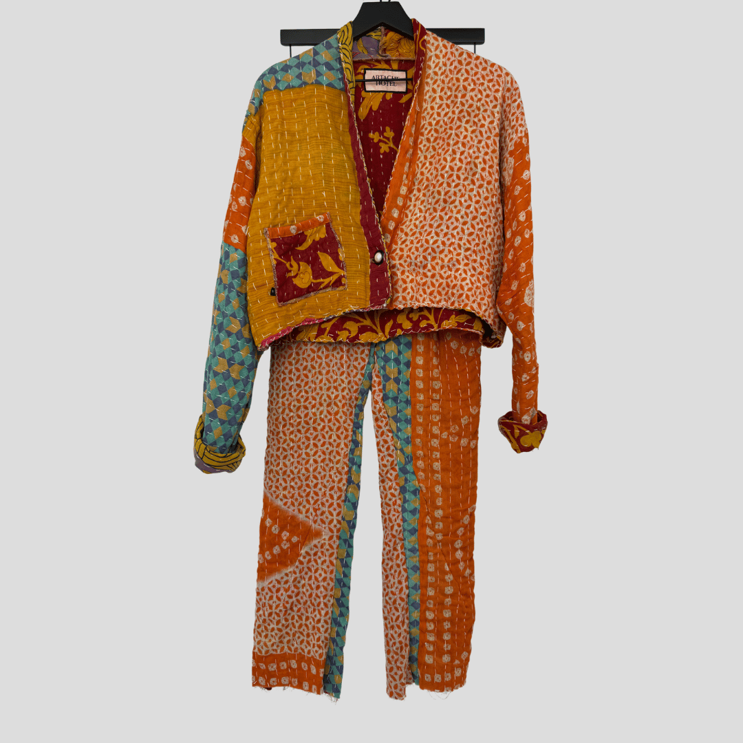 The Riding Jacket is equestrian-inspired, cut in a cropped fit that flips inside out for two distinct looks. One face shows bold orange block prints with blue and mustard contrasts, while the reverse carries red sari florals with layered kantha quilting. Vintage buttons sit on each side, joined by a discreet interior pocket. Each jacket is one-of-a-kind, with natural wear that reflects the sari’s age and use.