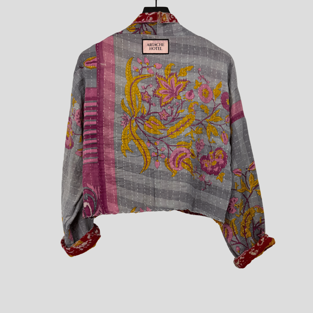 A reversible cropped riding jacket that carries equestrian inspiration with bold patchwork energy. Designed from vintage kantha blankets, no two jackets are the same.