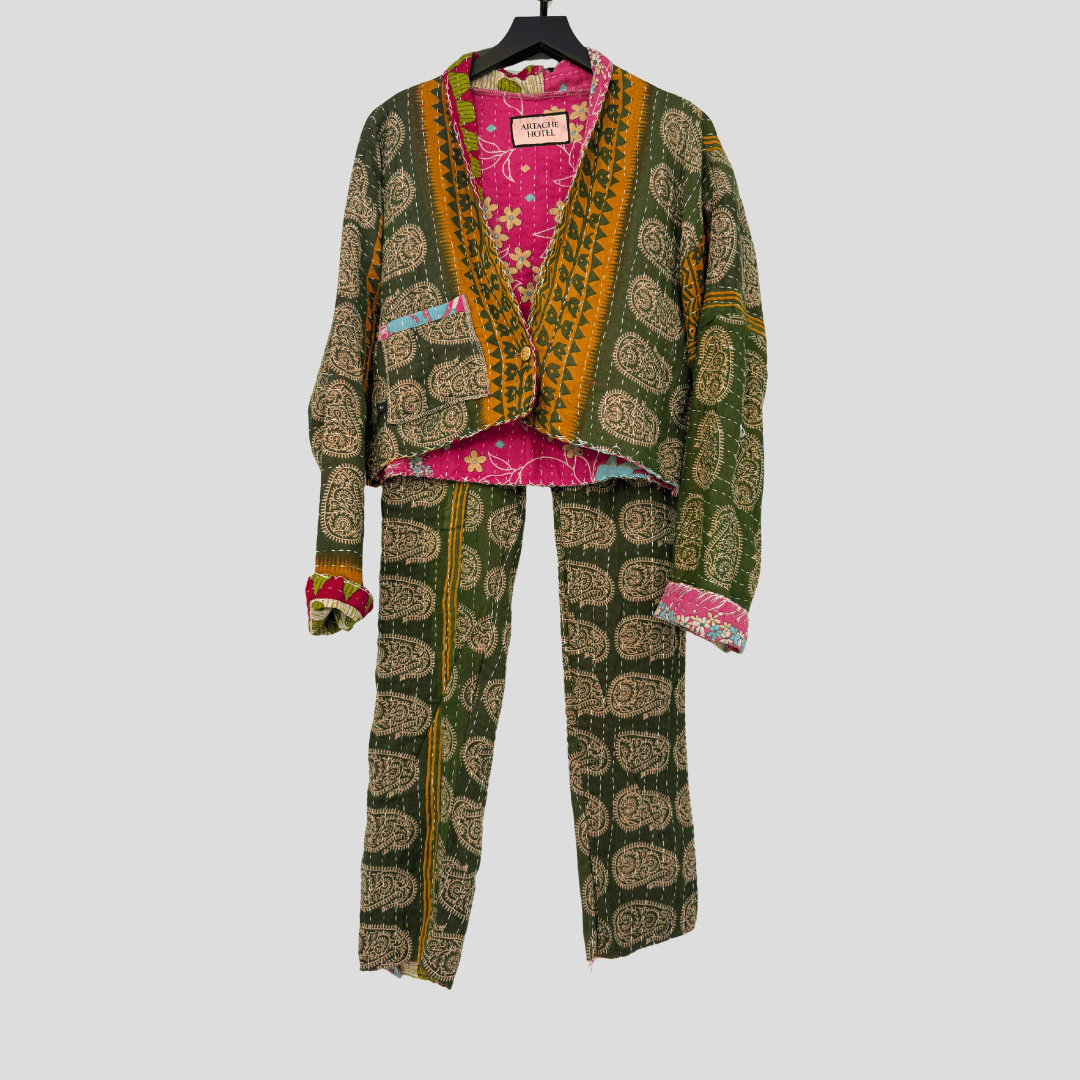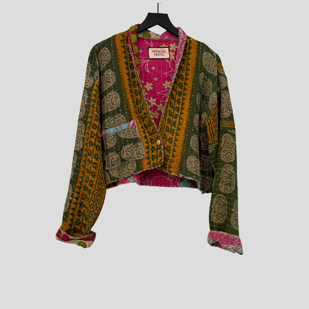 Reversible cropped jacket made from vintage sari quilts. Both sides show off the layered history of kantha stitching, blending bold florals, paisleys, and stripes.