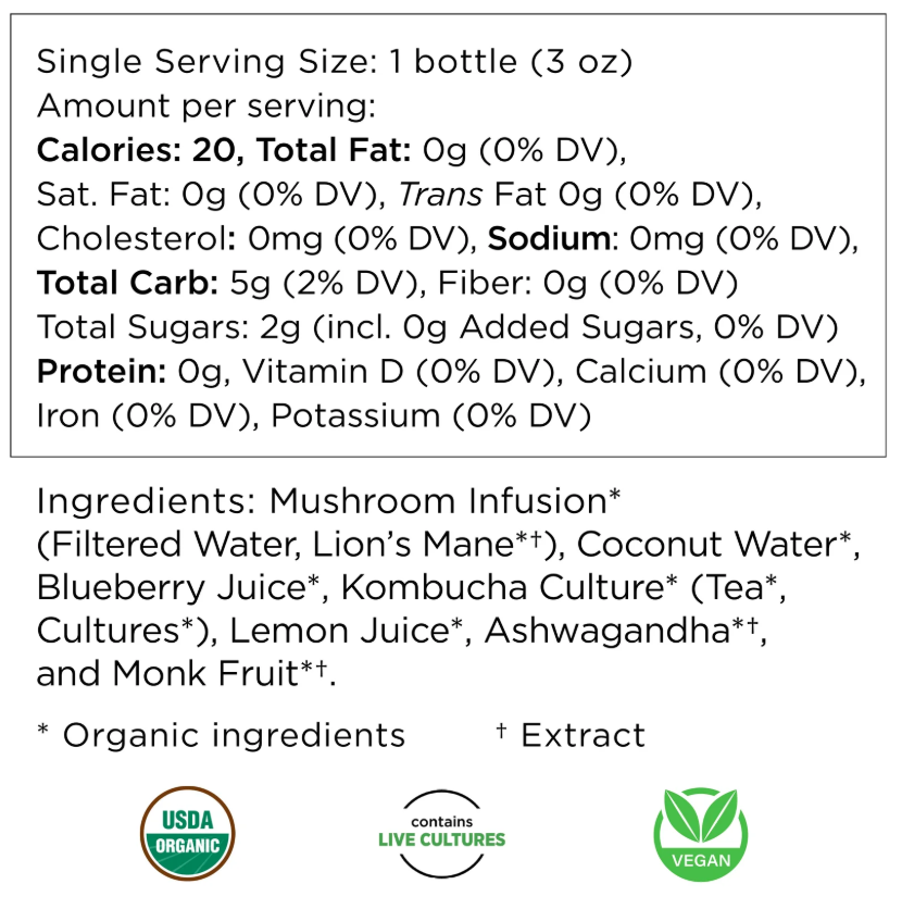 Formulated with Lion’s Mane extract — known as the “brain mushroom” — Mental Magic helps sharpen focus and boost cognitive performance naturally. Paired with antioxidant-rich blueberry juice, refreshing lemon, and calming ashwagandha, it blends brain fuel with stress support in one tasty shot. Kombucha cultures provide probiotics for gut–brain balance, while monk fruit keeps it lightly sweet without added sugar. With only 20 calories per bottle, it’s an easy way to support daily mental energy and clarity.