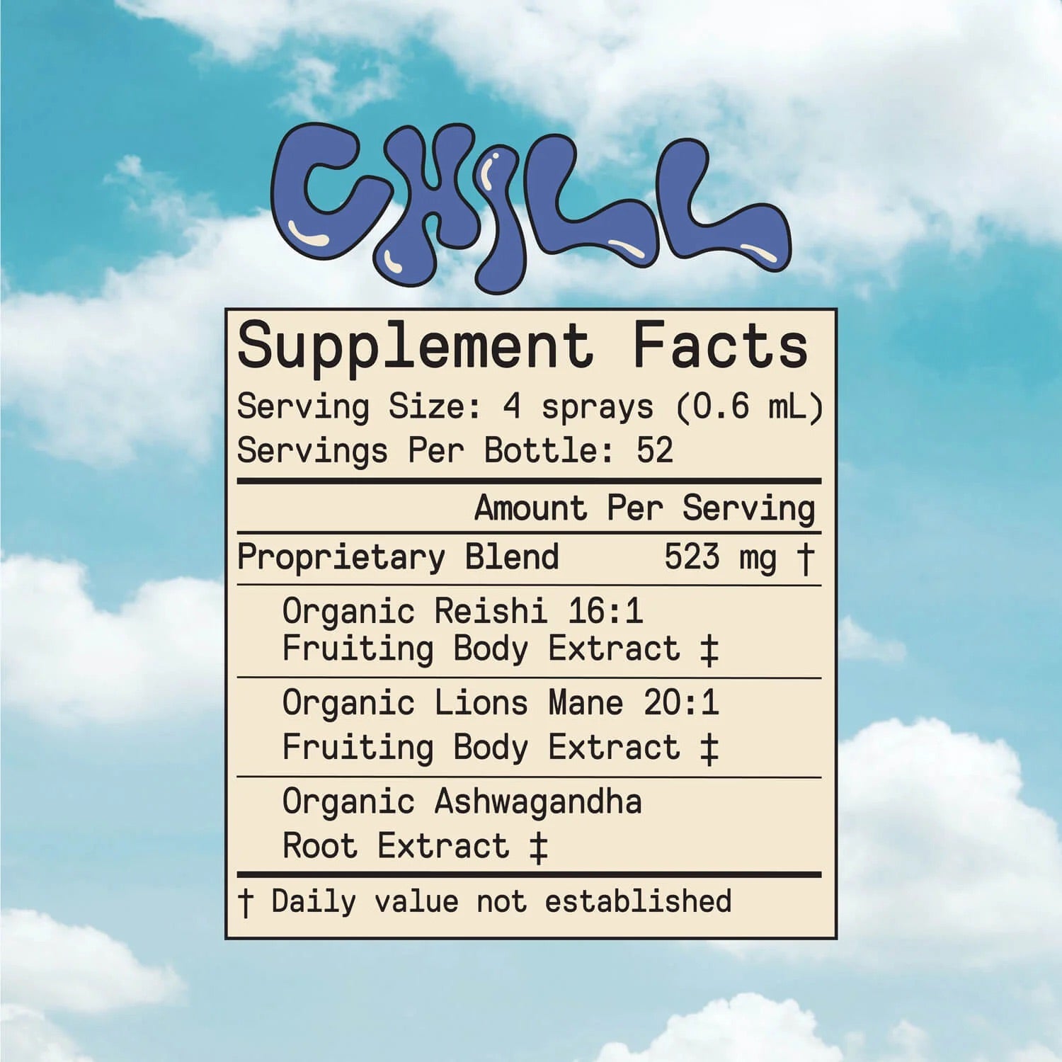 Daily Chill Mouth Spray combines organic adaptogens and functional mushrooms into a fast-absorbing spray that helps you find calm in moments of stress. Reishi supports balance, Ashwagandha eases tension, and Lion’s Mane promotes mental clarity. Hibiscus, lavender, and lemon add refreshing floral-citrus notes while monk fruit and honey round out the flavor naturally. With over 50 servings per bottle, this compact spray is an easy addition to your daily ritual — from mid-day pauses to bedtime wind-downs.