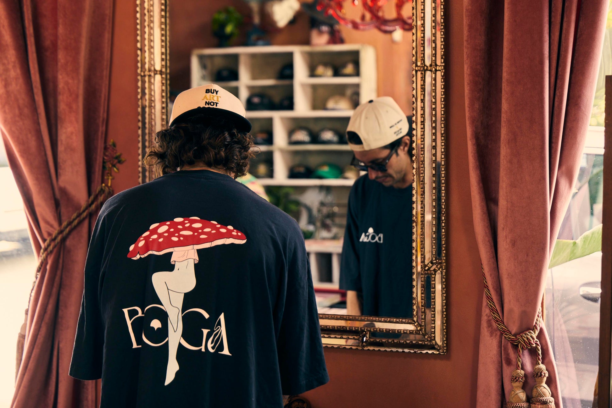Produced under the ArtAche Hotel label in collaboration with BOGA Venice. The red cap graphic references both natural growth and cultural imagination, tying fashion back to ritual and story.